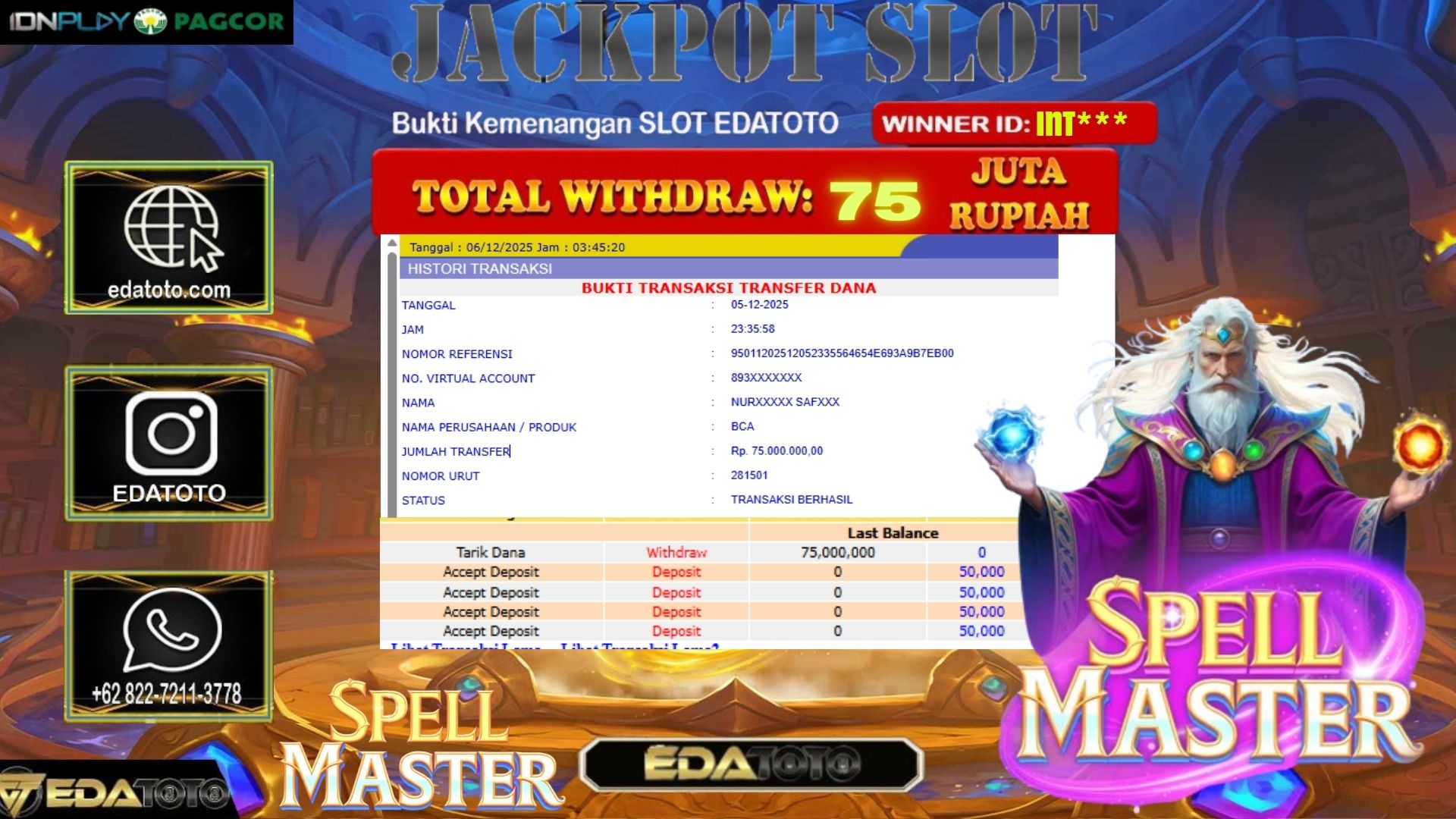 Selamat Kepada Pemilik user ID : FAN*** Hari/Tanggal :SELASA/ 9, Desember 2025 Jackpot : Rp. 75,825,000 JT Withdraw :75,000,000 JT . . .