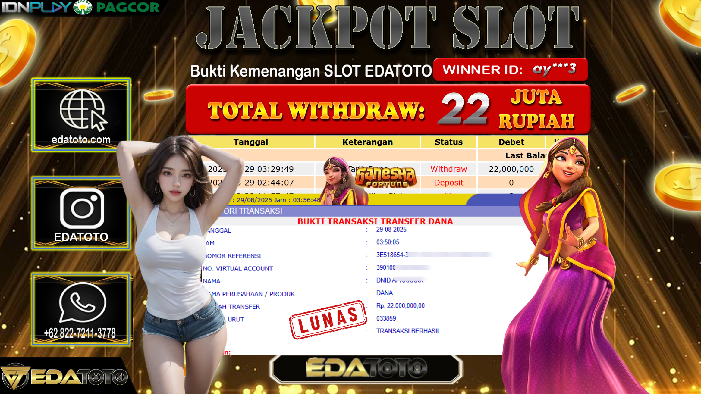 Selamat Kepada Pemilik user ID : ay***3 Hari/Tanggal : Jumat/ 29, Agustus 2025 Jackpot : Rp. 29.000.000 JT Permainan : . . .