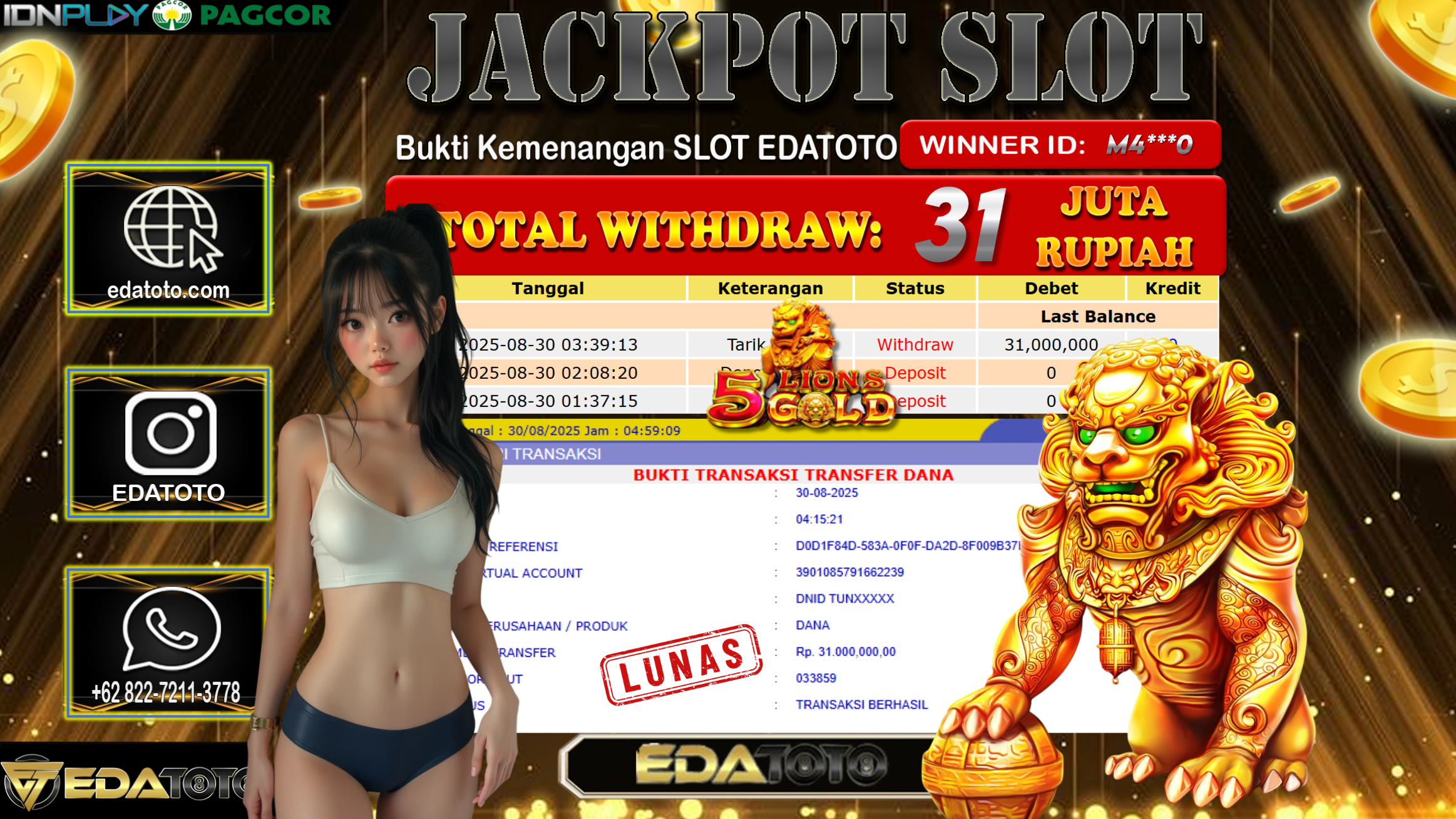 Selamat Kepada Pemilik user ID : M4***0 Hari/Tanggal : Sabtu/ 30, Agustus 2025 Jackpot : Rp. 31.000.000 JT Permainan : . . .