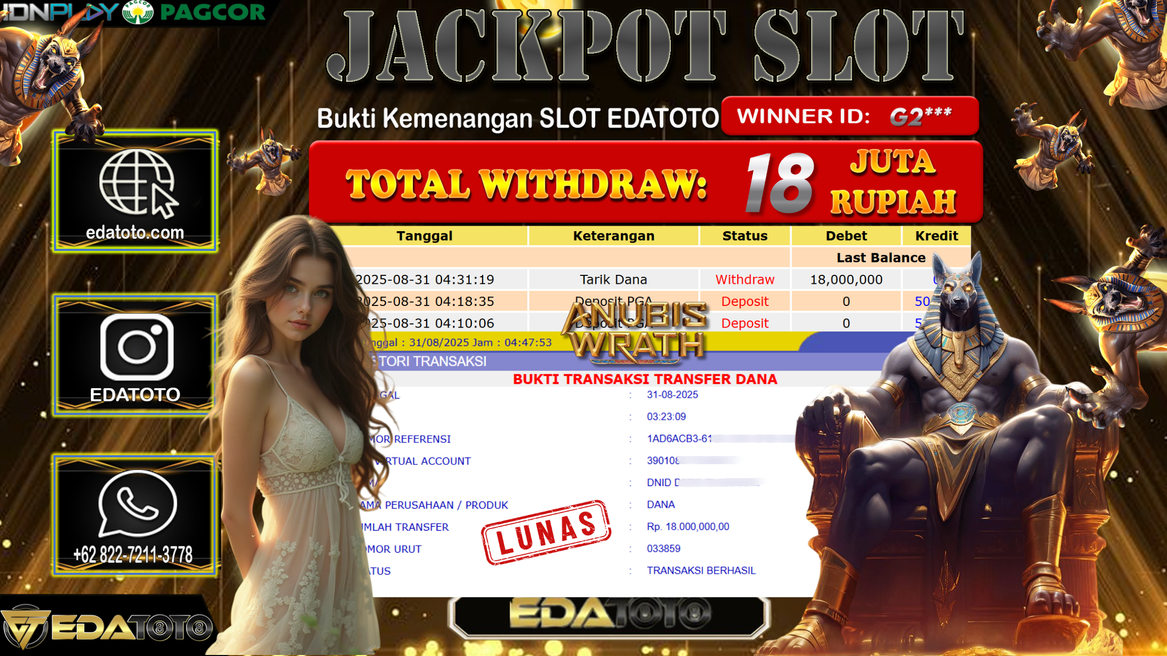 Selamat Kepada Pemilik user ID : G2*** Hari/Tanggal : Minggu/ 31, Agustus 2025 Jackpot : Rp. 18.000.000 JT Permainan : . . .