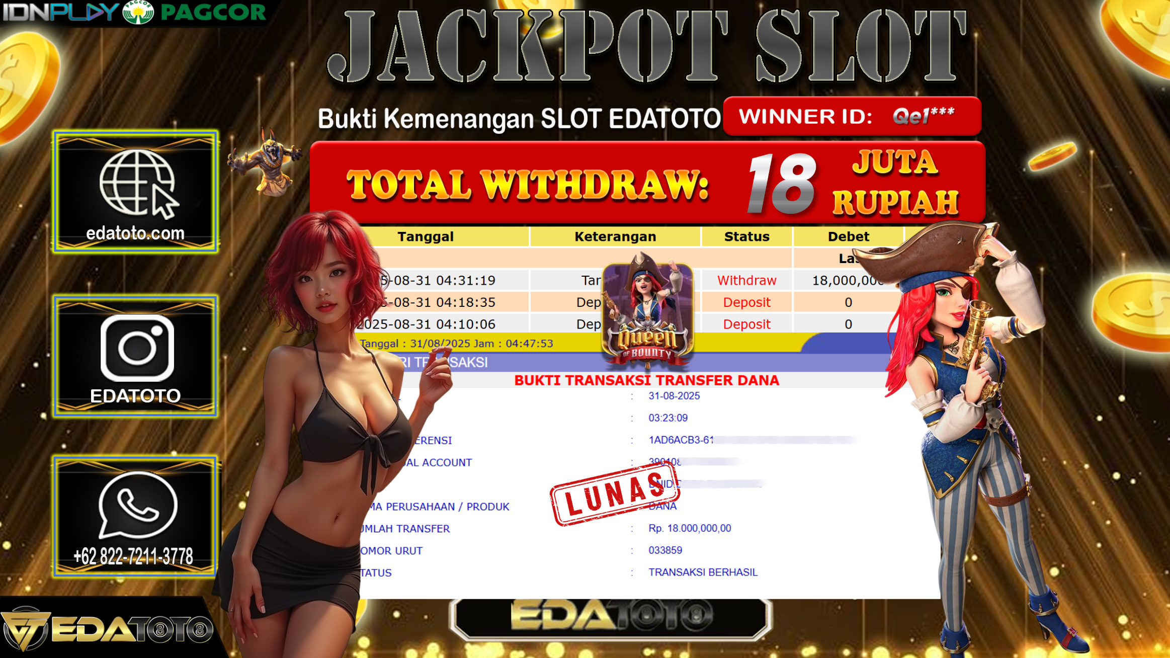 Selamat Kepada Pemilik user ID : Qe1*** Hari/Tanggal : Senin/ 1, September 2025 Jackpot : Rp. 18.000.000 JT Permainan : . . .