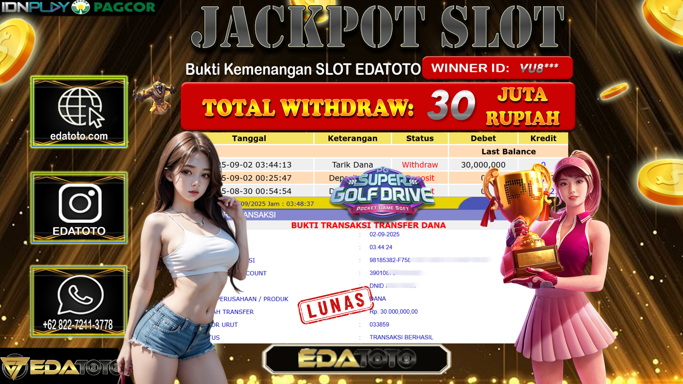 Selamat Kepada Pemilik user ID : VU8*** Hari/Tanggal : Selasa/ 2, September 2025 Jackpot : Rp. 30.000.000 JT Permainan : . . .