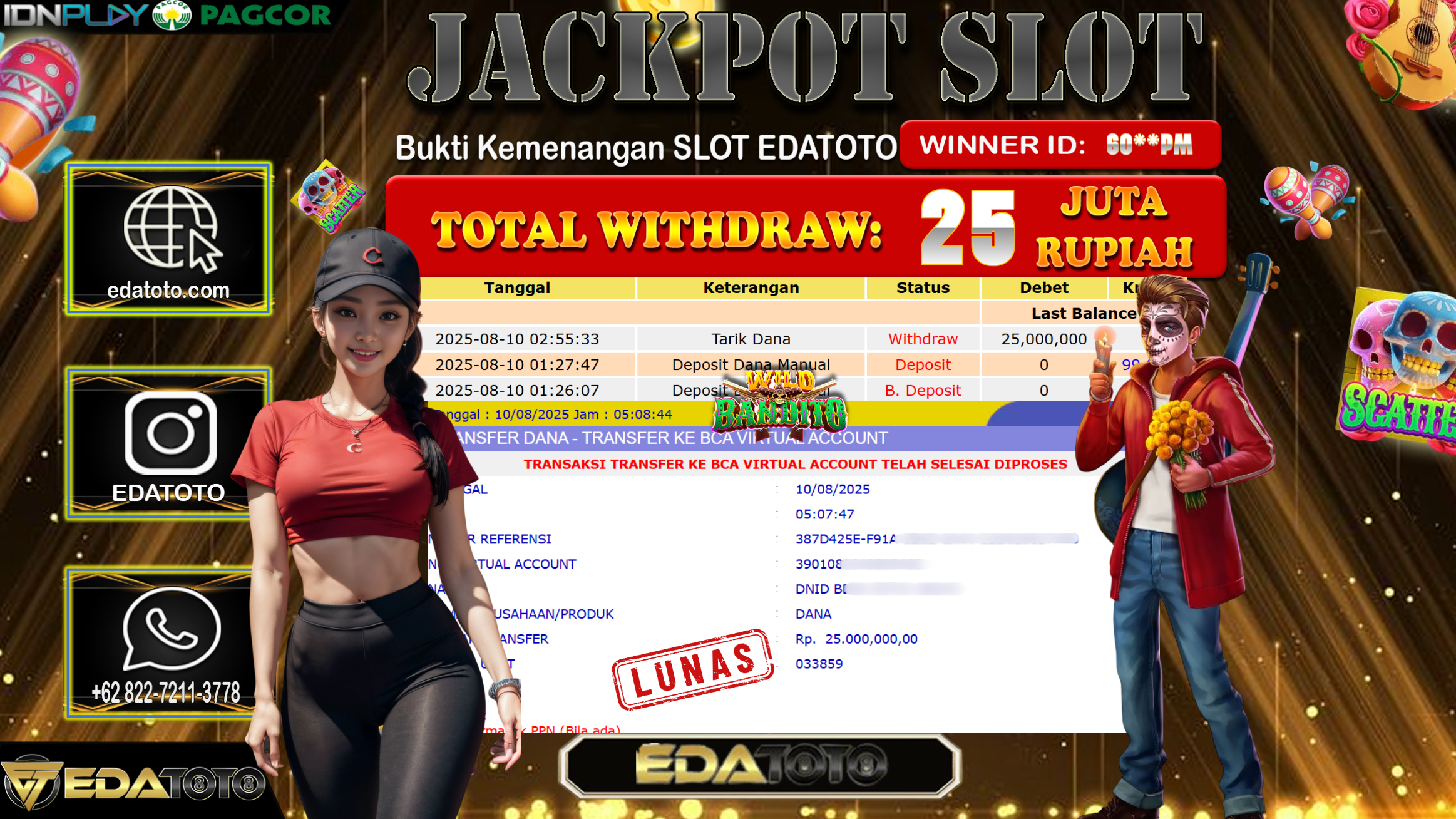 Selamat Kepada Pemilik user ID : 00***K Hari/Tanggal : Senin/ 11, Agustus 2025 Jackpot : Rp. 25.000.000 JT Permainan : . . .