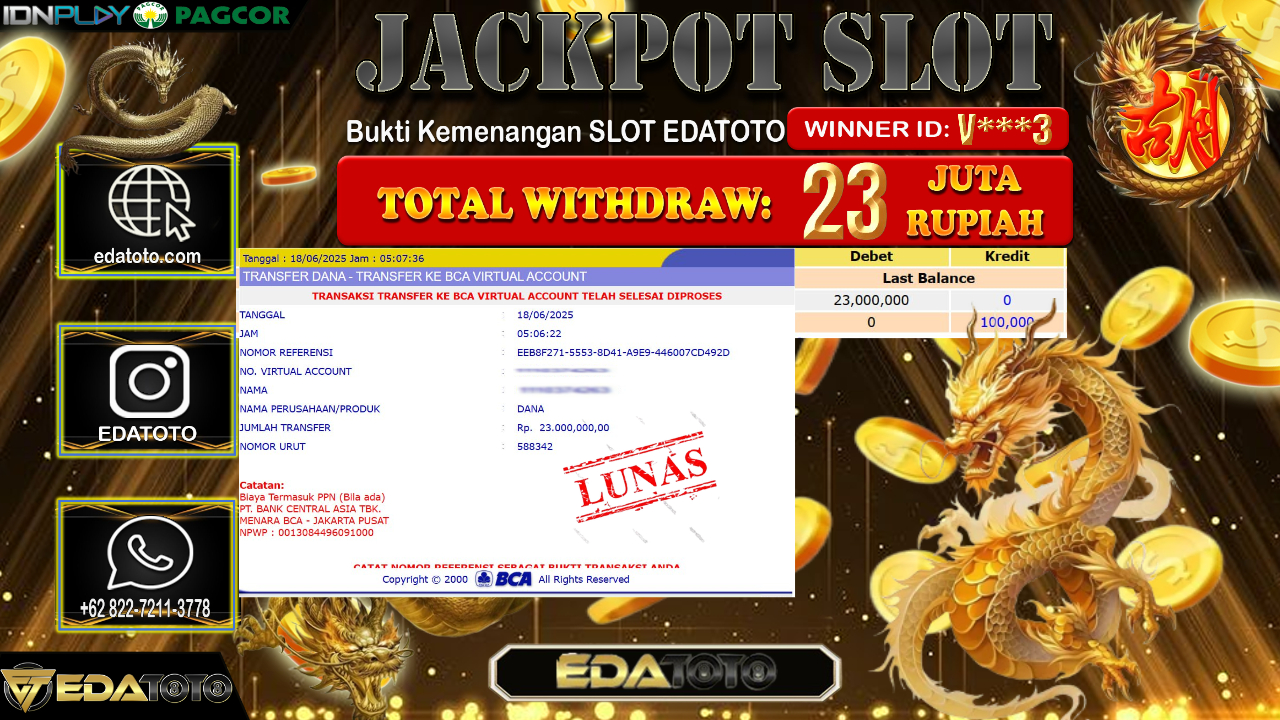Selamat Kepada Pemilik user ID : v***3 Hari/Tanggal : Rabu/ 18, Juni 2025 Jackpot : Rp. 23.000.000 JT Permainan : Mahjong . . .