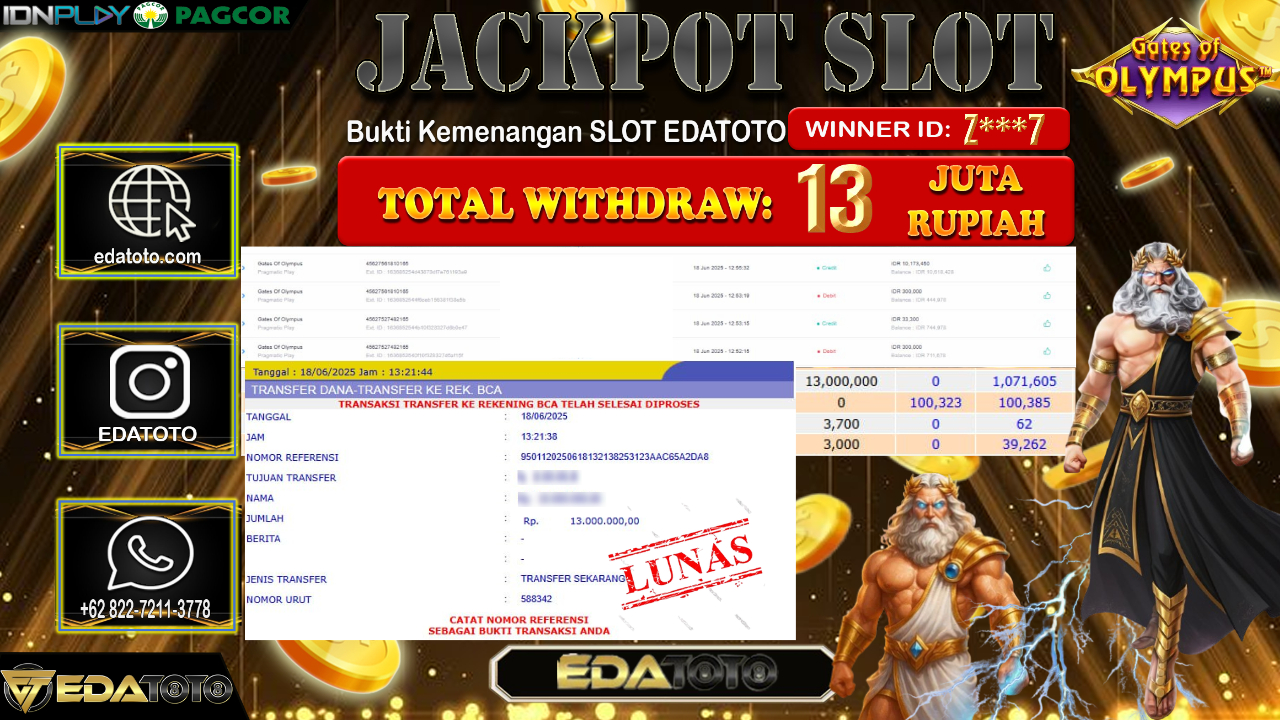 Selamat Kepada Pemilik user ID : Z***7 Hari/Tanggal : Kamis/ 19, Juni 2025 Jackpot : Rp. 13.000.000 JT Permainan : . . .